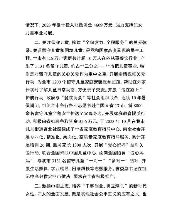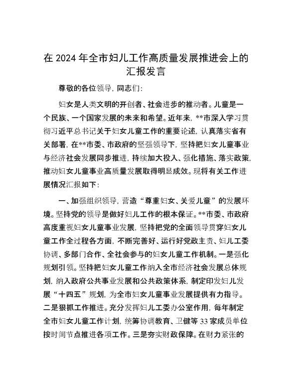 在2024年全市妇儿工作高质量发展推进会上的汇报发言 2024-09-27 Word模板 136 购买前,请一定要先点击这里看看,欢迎持续关注,精彩模板每天推送 预览结束,本文件为word文档,一共4页,共1851字,请购买后,下载后查看 购买前,请一定要先点击这里看看,欢迎持续关注,精彩模板每天推送 资源下载下载价格29 RMBVIP免费升级VIP点击检测网盘有效后购买有任何充值和下载问题请加微信:xuexixuexi66 0 演讲发言