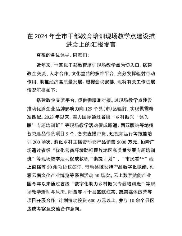 在2024年全市干部教育培训现场教学点建设推进会上的汇报发言 2024-09-27 Word模板 97 购买前,请一定要先点击这里看看,欢迎持续关注,精彩模板每天推送 预览结束,本文件为word文档,一共3页,共1098字,请购买后,下载后查看 购买前,请一定要先点击这里看看,欢迎持续关注,精彩模板每天推送 资源下载下载价格29 RMBVIP免费升级VIP点击检测网盘有效后购买有任何充值和下载问题请加微信:xuexixuexi66 0 演讲发言