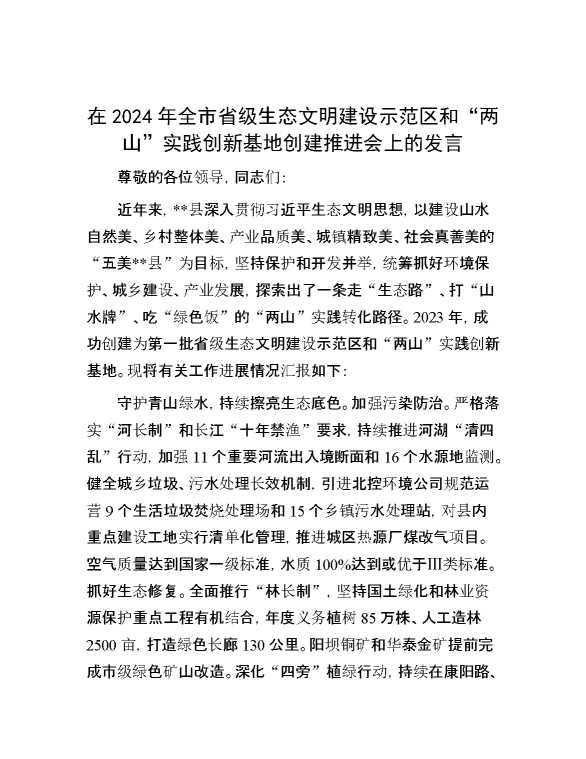 在2024年全市省级生态文明建设示范区和“两山”实践创新基地创建推进会上的发言 2024-09-27 Word模板 100 购买前,请一定要先点击这里看看,欢迎持续关注,精彩模板每天推送 预览结束,本文件为word文档,一共5页,共2160字,请购买后,下载后查看 购买前,请一定要先点击这里看看,欢迎持续关注,精彩模板每天推送 资源下载下载价格29 RMBVIP免费升级VIP点击检测网盘有效后购买有任何充值和下载问题请加微信:xuexixuexi66 0 演讲发言