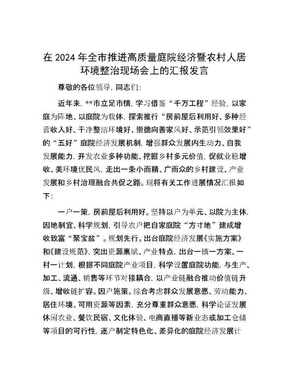 在2024年全市推进高质量庭院经济暨农村人居环境整治现场会上的汇报发言 2024-09-27 Word模板 135 购买前,请一定要先点击这里看看,欢迎持续关注,精彩模板每天推送 预览结束,本文件为word文档,一共6页,共2480字,请购买后,下载后查看 购买前,请一定要先点击这里看看,欢迎持续关注,精彩模板每天推送 资源下载下载价格29 RMBVIP免费升级VIP点击检测网盘有效后购买有任何充值和下载问题请加微信:xuexixuexi66 0 演讲发言