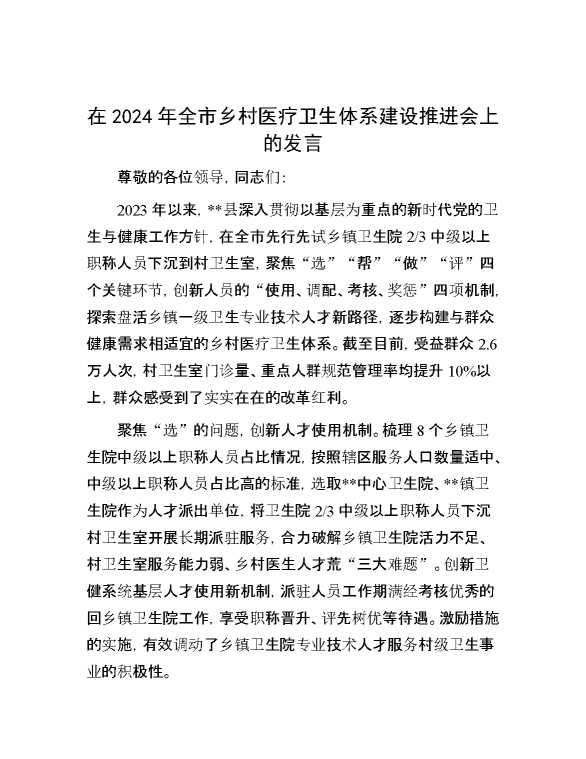在2024年全市乡村医疗卫生体系建设推进会上的发言 2024-09-27 Word模板 96 购买前,请一定要先点击这里看看,欢迎持续关注,精彩模板每天推送 预览结束,本文件为word文档,一共3页,共1384字,请购买后,下载后查看 购买前,请一定要先点击这里看看,欢迎持续关注,精彩模板每天推送 资源下载下载价格29 RMBVIP免费升级VIP点击检测网盘有效后购买有任何充值和下载问题请加微信:xuexixuexi66 0 演讲发言