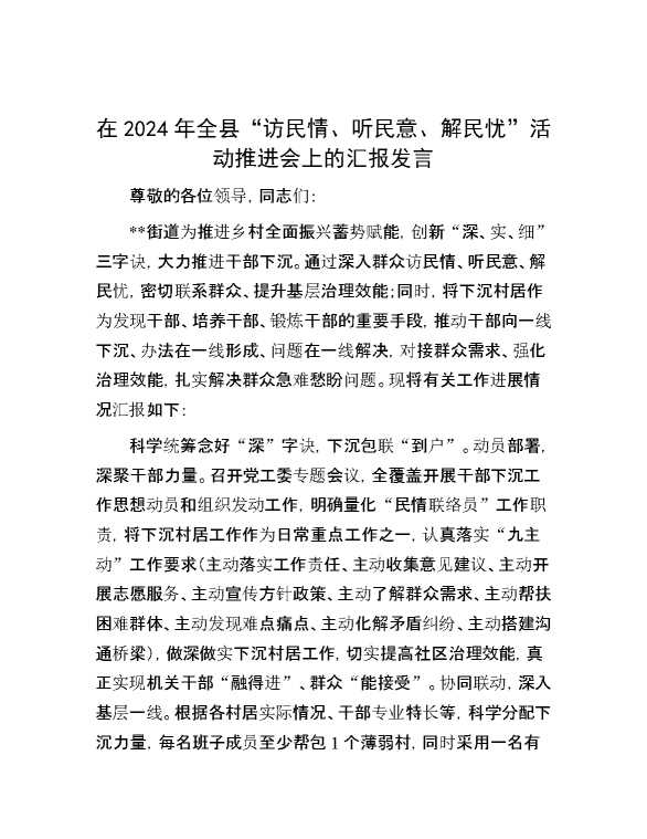 在2024年全县“访民情、听民意、解民忧”活动推进会上的汇报发言 2024-09-27 Word模板 101 购买前,请一定要先点击这里看看,欢迎持续关注,精彩模板每天推送 预览结束,本文件为word文档,一共3页,共1420字,请购买后,下载后查看 购买前,请一定要先点击这里看看,欢迎持续关注,精彩模板每天推送 资源下载下载价格29 RMBVIP免费升级VIP点击检测网盘有效后购买有任何充值和下载问题请加微信:xuexixuexi66 0 演讲发言