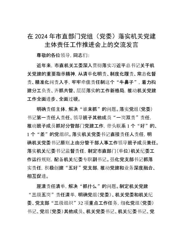 在2024年市直部门党组(党委)落实机关党建主体责任工作推进会上的交流发言 2024-09-27 Word模板 87 购买前,请一定要先点击这里看看,欢迎持续关注,精彩模板每天推送 预览结束,本文件为word文档,一共3页,共1128字,请购买后,下载后查看 购买前,请一定要先点击这里看看,欢迎持续关注,精彩模板每天推送 资源下载下载价格29 RMBVIP免费升级VIP点击检测网盘有效后购买有任何充值和下载问题请加微信:xuexixuexi66 0 演讲发言