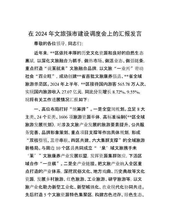 在2024年文旅强市建设调度会上的汇报发言 2024-09-27 Word模板 94 购买前,请一定要先点击这里看看,欢迎持续关注,精彩模板每天推送 预览结束,本文件为word文档,一共4页,共2009字,请购买后,下载后查看 购买前,请一定要先点击这里看看,欢迎持续关注,精彩模板每天推送 资源下载下载价格29 RMBVIP免费升级VIP点击检测网盘有效后购买有任何充值和下载问题请加微信:xuexixuexi66 0 演讲发言