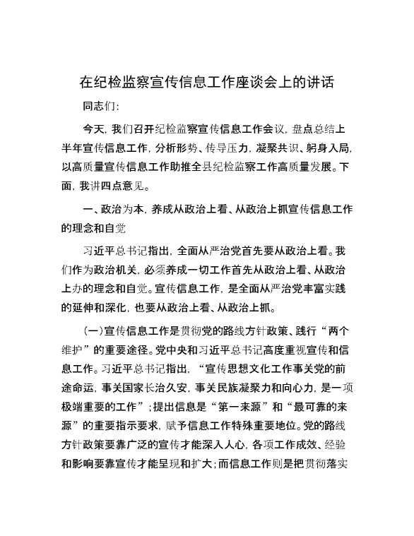 在纪检监察宣传信息工作座谈会上的讲话 2024-09-27 Word模板 85 购买前,请一定要先点击这里看看,欢迎持续关注,精彩模板每天推送 预览结束,本文件为word文档,一共7页,共3358字,请购买后,下载后查看 购买前,请一定要先点击这里看看,欢迎持续关注,精彩模板每天推送 资源下载下载价格29 RMBVIP免费升级VIP点击检测网盘有效后购买有任何充值和下载问题请加微信:xuexixuexi66 0 演讲发言