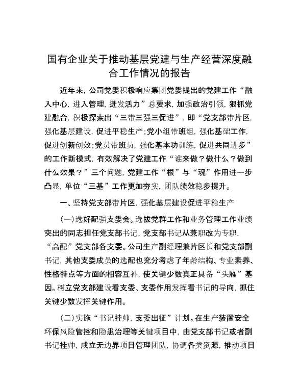 国有企业关于推动基层党建与生产经营深度融合工作情况的报告 2024-09-28 Word模板 75 购买前,请一定要先点击这里看看,欢迎持续关注,精彩模板每天推送 预览结束,本文件为word文档,一共5页,共2061字,请购买后,下载后查看 购买前,请一定要先点击这里看看,欢迎持续关注,精彩模板每天推送 资源下载下载价格29 RMBVIP免费升级VIP点击检测网盘有效后购买有任何充值和下载问题请加微信:xuexixuexi66 0 总结汇报