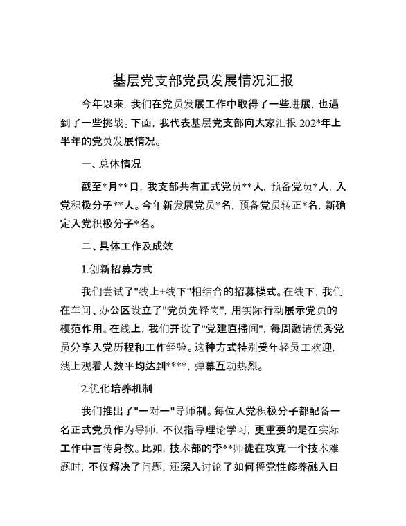 基层党支部党员发展情况汇报 2024-09-28 Word模板 76 购买前,请一定要先点击这里看看,欢迎持续关注,精彩模板每天推送 预览结束,本文件为word文档,一共4页,共1529字,请购买后,下载后查看 购买前,请一定要先点击这里看看,欢迎持续关注,精彩模板每天推送 资源下载下载价格29 RMBVIP免费升级VIP点击检测网盘有效后购买有任何充值和下载问题请加微信:xuexixuexi66 0 总结汇报