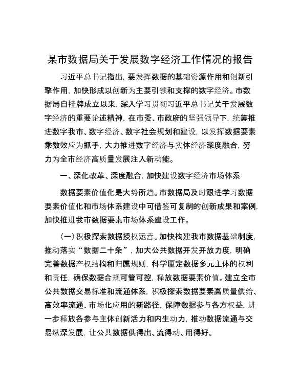 某市数据局关于发展数字经济工作情况的报告 2024-09-28 Word模板 71 购买前,请一定要先点击这里看看,欢迎持续关注,精彩模板每天推送 预览结束,本文件为word文档,一共5页,共2059字,请购买后,下载后查看 购买前,请一定要先点击这里看看,欢迎持续关注,精彩模板每天推送 资源下载下载价格29 RMBVIP免费升级VIP点击检测网盘有效后购买有任何充值和下载问题请加微信:xuexixuexi66 0 总结汇报