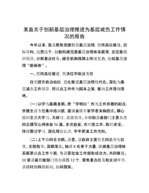 某县关于创新基层治理推进为基层减负工作情况的报告 2024-09-28 Word模板 72 购买前,请一定要先点击这里看看,欢迎持续关注,精彩模板每天推送 预览结束,本文件为word文档,一共4页,共1762字,请购买后,下载后查看 购买前,请一定要先点击这里看看,欢迎持续关注,精彩模板每天推送 资源下载下载价格29 RMBVIP免费升级VIP点击检测网盘有效后购买有任何充值和下载问题请加微信:xuexixuexi66 0 总结汇报