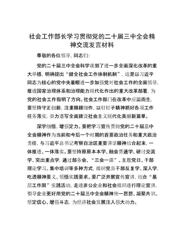 社会工作部长学习贯彻党的二十届三中全会精神交流发言材料 2024-09-29 Word模板 68 购买前,请一定要先点击这里看看,欢迎持续关注,精彩模板每天推送 预览结束,本文件为word文档,一共4页,共1506字,请购买后,下载后查看 购买前,请一定要先点击这里看看,欢迎持续关注,精彩模板每天推送 资源下载下载价格29 RMBVIP免费升级VIP点击检测网盘有效后购买有任何充值和下载问题请加微信:xuexixuexi66 0 演讲发言