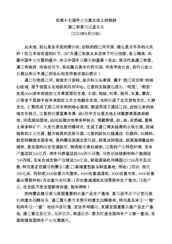 通辽市委书记孟宪东:在第十七届牛业发展大会上的致辞 2024-09-29 Word模板 80 购买前,请一定要先点击这里看看,欢迎持续关注,精彩模板每天推送 预览结束,本文件为word文档,一共2页,共1726字,请购买后,下载后查看 购买前,请一定要先点击这里看看,欢迎持续关注,精彩模板每天推送 资源下载下载价格29 RMBVIP免费升级VIP点击检测网盘有效后购买有任何充值和下载问题请加微信:xuexixuexi66 0 演讲发言