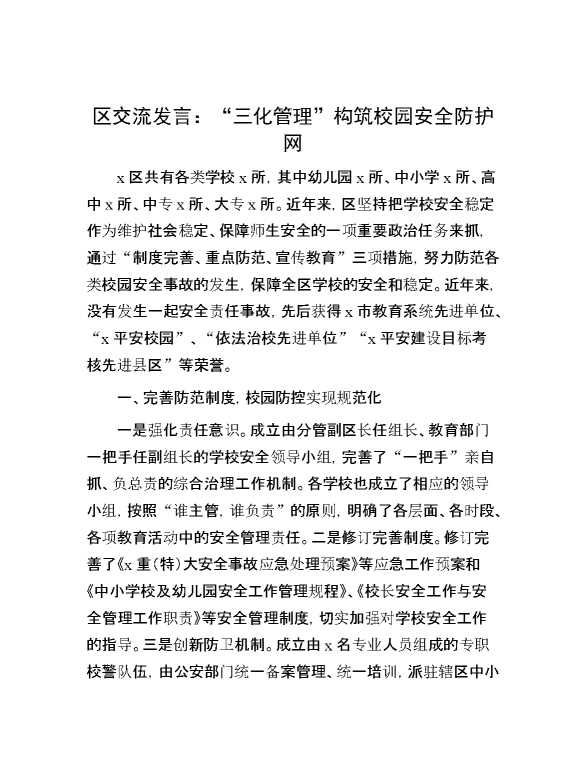 区交流发言:“三化管理”构筑校园安全防护网 2024-09-29 Word模板 69 购买前,请一定要先点击这里看看,欢迎持续关注,精彩模板每天推送 预览结束,本文件为word文档,一共4页,共1562字,请购买后,下载后查看 购买前,请一定要先点击这里看看,欢迎持续关注,精彩模板每天推送 资源下载下载价格29 RMBVIP免费升级VIP点击检测网盘有效后购买有任何充值和下载问题请加微信:xuexixuexi66 0 演讲发言
