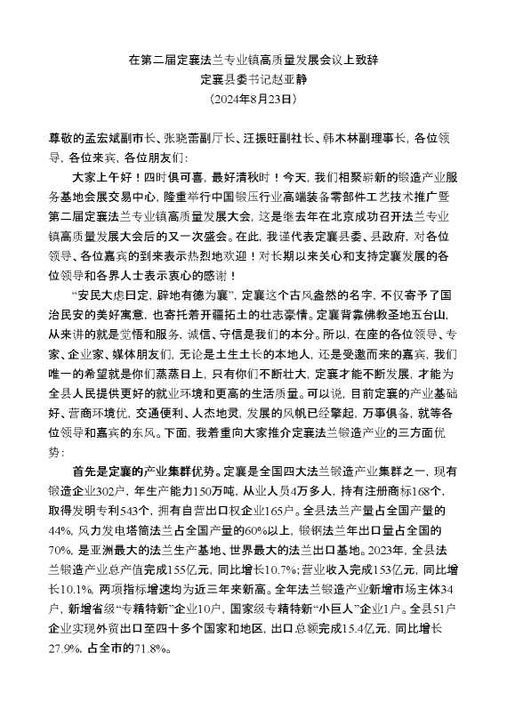 定襄县委书记赵亚静:在第二届定襄法兰专业镇高质量发展会议上致辞 2024-09-29 Word模板 81 购买前,请一定要先点击这里看看,欢迎持续关注,精彩模板每天推送 预览结束,本文件为word文档,一共3页,共1746字,请购买后,下载后查看 购买前,请一定要先点击这里看看,欢迎持续关注,精彩模板每天推送 资源下载下载价格29 RMBVIP免费升级VIP点击检测网盘有效后购买有任何充值和下载问题请加微信:xuexixuexi66 0 演讲发言