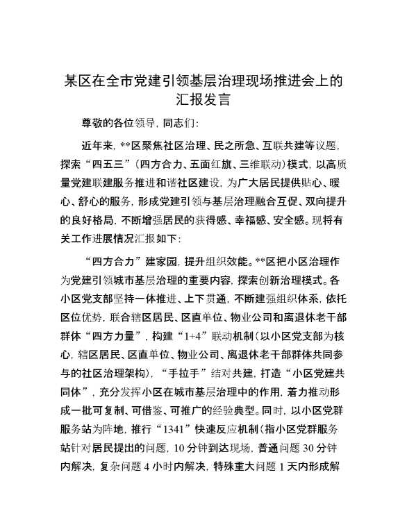 某区在全市党建引领基层治理现场推进会上的汇报发言 2024-09-29 Word模板 74 购买前,请一定要先点击这里看看,欢迎持续关注,精彩模板每天推送 预览结束,本文件为word文档,一共4页,共1546字,请购买后,下载后查看 购买前,请一定要先点击这里看看,欢迎持续关注,精彩模板每天推送 资源下载下载价格29 RMBVIP免费升级VIP点击检测网盘有效后购买有任何充值和下载问题请加微信:xuexixuexi66 0 演讲发言