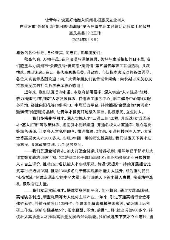 惠民县委书记王玮:在滨州市“会聚良缘 黄河恋 渤海情”第五届青年职工联谊活动仪式上的致辞 2024-09-29 Word模板 76 购买前,请一定要先点击这里看看,欢迎持续关注,精彩模板每天推送 预览结束,本文件为word文档,一共2页,共1330字,请购买后,下载后查看 购买前,请一定要先点击这里看看,欢迎持续关注,精彩模板每天推送 资源下载下载价格29 RMBVIP免费升级VIP点击检测网盘有效后购买有任何充值和下载问题请加微信:xuexixuexi66 0 演讲发言