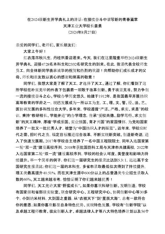 天津工业大学校长姜勇:在2024级新生开学典礼上的讲话 2024-09-29 Word模板 73 购买前,请一定要先点击这里看看,欢迎持续关注,精彩模板每天推送 预览结束,本文件为word文档,一共3页,共2372字,请购买后,下载后查看 购买前,请一定要先点击这里看看,欢迎持续关注,精彩模板每天推送 资源下载下载价格29 RMBVIP免费升级VIP点击检测网盘有效后购买有任何充值和下载问题请加微信:xuexixuexi66 0 演讲发言