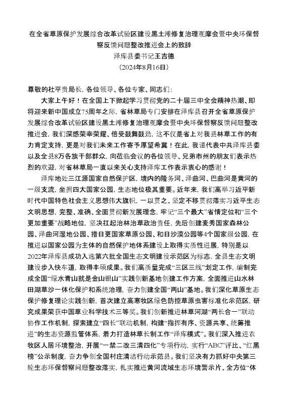 王吉德:在草原保护发展综合改革试验区建设黑土滩修复治理观摩会暨中央环保督察反馈问题整改推进会上的致辞 2024-09-29 Word模板 70 购买前,请一定要先点击这里看看,欢迎持续关注,精彩模板每天推送 预览结束,本文件为word文档,一共2页,共1501字,请购买后,下载后查看 购买前,请一定要先点击这里看看,欢迎持续关注,精彩模板每天推送 资源下载下载价格29 RMBVIP免费升级VIP点击检测网盘有效后购买有任何充值和下载问题请加微信:xuexixuexi66 0 演讲发言