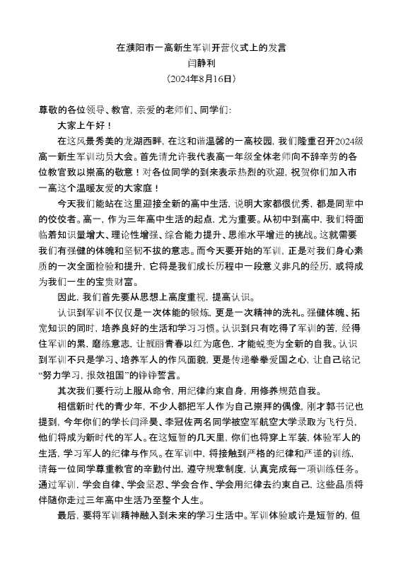 闫静利:在濮阳市一高新生军训开营仪式上的发言 2024-09-29 Word模板 80 购买前,请一定要先点击这里看看,欢迎持续关注,精彩模板每天推送 预览结束,本文件为word文档,一共2页,共1070字,请购买后,下载后查看 购买前,请一定要先点击这里看看,欢迎持续关注,精彩模板每天推送 资源下载下载价格29 RMBVIP免费升级VIP点击检测网盘有效后购买有任何充值和下载问题请加微信:xuexixuexi66 0 演讲发言