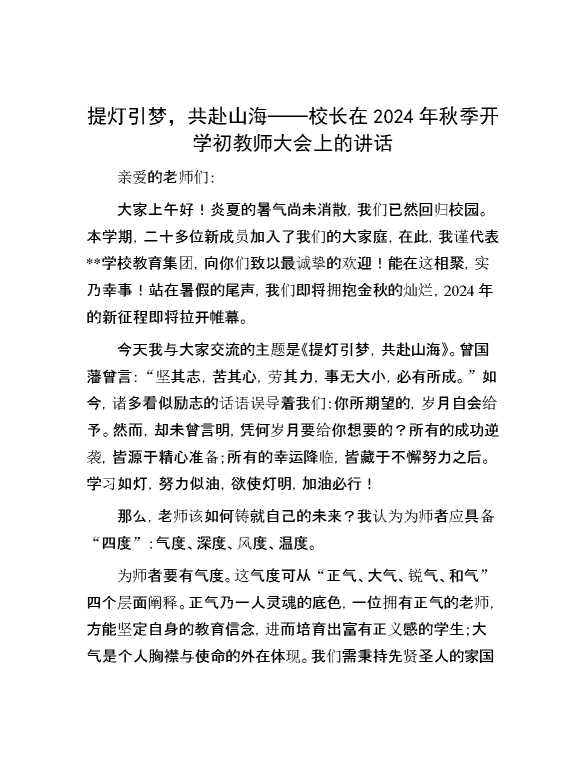 提灯引梦,共赴山海——校长在 2024 年秋季开学初教师大会上的讲话 2024-09-29 Word模板 115 购买前,请一定要先点击这里看看,欢迎持续关注,精彩模板每天推送 预览结束,本文件为word文档,一共4页,共1657字,请购买后,下载后查看 购买前,请一定要先点击这里看看,欢迎持续关注,精彩模板每天推送 资源下载下载价格29 RMBVIP免费升级VIP点击检测网盘有效后购买有任何充值和下载问题请加微信:xuexixuexi66 0 演讲发言