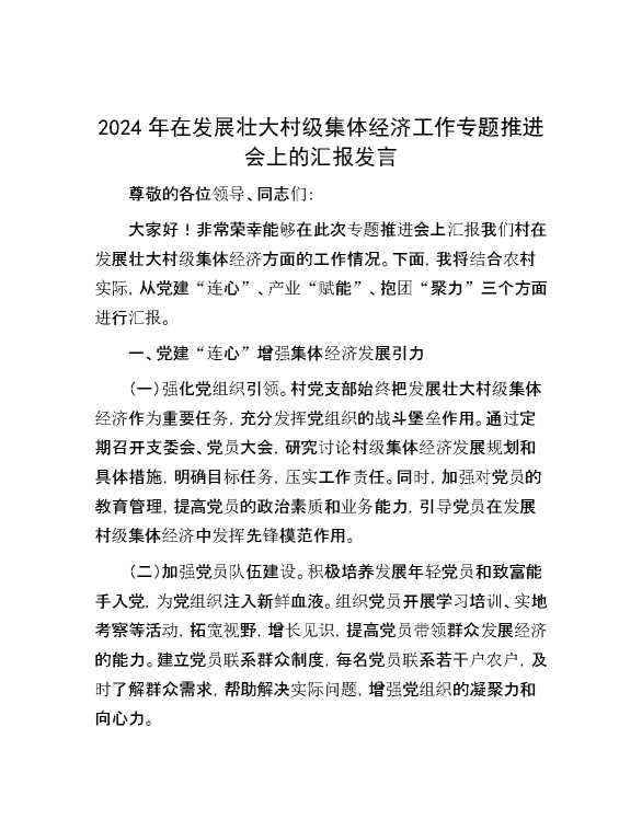 2024年在发展壮大村级集体经济工作专题推进会上的汇报发言 2024-09-29 Word模板 105 购买前,请一定要先点击这里看看,欢迎持续关注,精彩模板每天推送 预览结束,本文件为word文档,一共4页,共1495字,请购买后,下载后查看 购买前,请一定要先点击这里看看,欢迎持续关注,精彩模板每天推送 资源下载下载价格29 RMBVIP免费升级VIP点击检测网盘有效后购买有任何充值和下载问题请加微信:xuexixuexi66 0 演讲发言