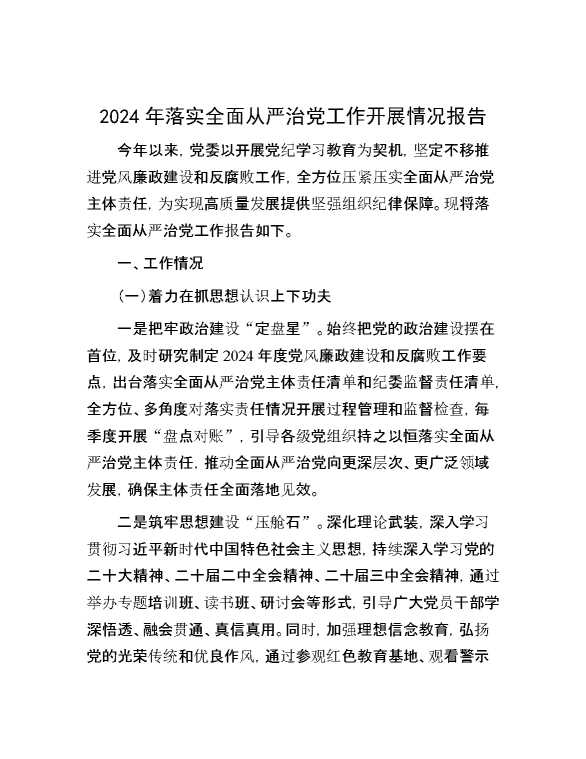 2024年落实全面从严治党工作开展情况报告 2024-09-29 Word模板 87 购买前,请一定要先点击这里看看,欢迎持续关注,精彩模板每天推送 预览结束,本文件为word文档,一共5页,共2330字,请购买后,下载后查看 购买前,请一定要先点击这里看看,欢迎持续关注,精彩模板每天推送 资源下载下载价格29 RMBVIP免费升级VIP点击检测网盘有效后购买有任何充值和下载问题请加微信:xuexixuexi66 0 总结汇报