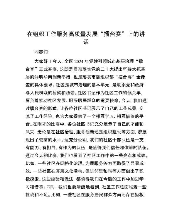 在组织工作服务高质量发展“擂台赛”上的讲话 2024-09-29 Word模板 89 购买前,请一定要先点击这里看看,欢迎持续关注,精彩模板每天推送 预览结束,本文件为word文档,一共3页,共1137字,请购买后,下载后查看 购买前,请一定要先点击这里看看,欢迎持续关注,精彩模板每天推送 资源下载下载价格29 RMBVIP免费升级VIP点击检测网盘有效后购买有任何充值和下载问题请加微信:xuexixuexi66 0 演讲发言