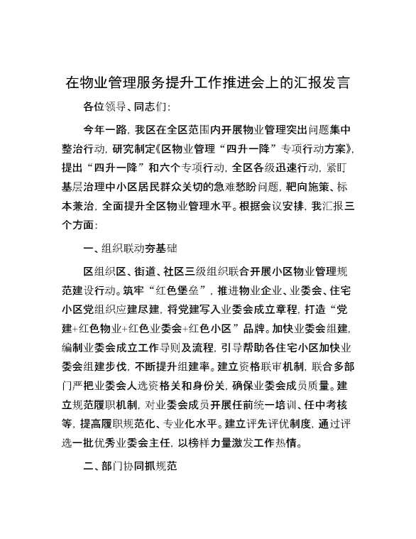 在物业管理服务提升工作推进会上的汇报发言 2024-09-29 Word模板 97 购买前,请一定要先点击这里看看,欢迎持续关注,精彩模板每天推送 预览结束,本文件为word文档,一共3页,共939字,请购买后,下载后查看 购买前,请一定要先点击这里看看,欢迎持续关注,精彩模板每天推送 资源下载下载价格29 RMBVIP免费升级VIP点击检测网盘有效后购买有任何充值和下载问题请加微信:xuexixuexi66 0 演讲发言