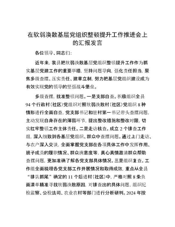 在软弱涣散基层党组织整顿提升工作推进会上的汇报发言 2024-09-29 Word模板 90 购买前,请一定要先点击这里看看,欢迎持续关注,精彩模板每天推送 预览结束,本文件为word文档,一共3页,共1300字,请购买后,下载后查看 购买前,请一定要先点击这里看看,欢迎持续关注,精彩模板每天推送 资源下载下载价格29 RMBVIP免费升级VIP点击检测网盘有效后购买有任何充值和下载问题请加微信:xuexixuexi66 0 演讲发言