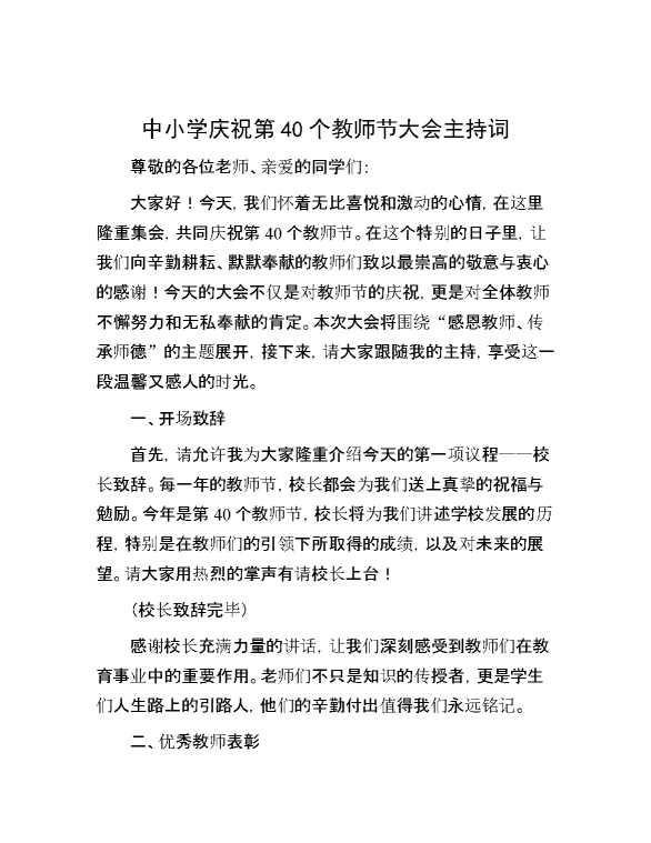 中小学庆祝第40个教师节大会主持词 2024-09-29 Word模板 88 购买前,请一定要先点击这里看看,欢迎持续关注,精彩模板每天推送 预览结束,本文件为word文档,一共4页,共1417字,请购买后,下载后查看 购买前,请一定要先点击这里看看,欢迎持续关注,精彩模板每天推送 资源下载下载价格29 RMBVIP免费升级VIP点击检测网盘有效后购买有任何充值和下载问题请加微信:xuexixuexi66 0 总结汇报