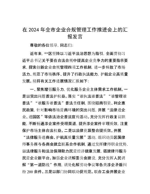 在2024年全市企业合规管理工作推进会上的汇报发言 2024-09-29 Word模板 85 购买前,请一定要先点击这里看看,欢迎持续关注,精彩模板每天推送 预览结束,本文件为word文档,一共4页,共1679字,请购买后,下载后查看 购买前,请一定要先点击这里看看,欢迎持续关注,精彩模板每天推送 资源下载下载价格29 RMBVIP免费升级VIP点击检测网盘有效后购买有任何充值和下载问题请加微信:xuexixuexi66 0 演讲发言
