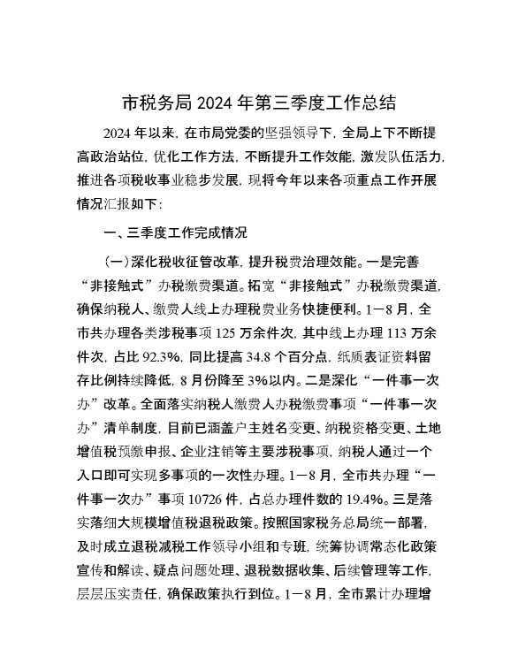 市税务局2024年第三季度工作总结 2024-09-29 Word模板 88 购买前,请一定要先点击这里看看,欢迎持续关注,精彩模板每天推送 预览结束,本文件为word文档,一共5页,共2132字,请购买后,下载后查看 购买前,请一定要先点击这里看看,欢迎持续关注,精彩模板每天推送 资源下载下载价格29 RMBVIP免费升级VIP点击检测网盘有效后购买有任何充值和下载问题请加微信:xuexixuexi66 0 总结汇报