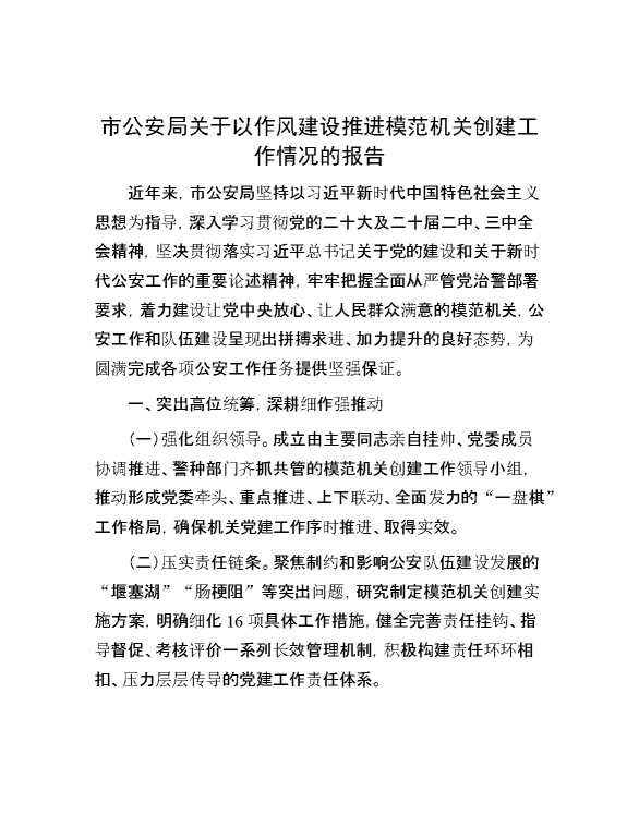 市公安局关于以作风建设推进模范机关创建工作情况的报告 2024-09-29 Word模板 90 购买前,请一定要先点击这里看看,欢迎持续关注,精彩模板每天推送 预览结束,本文件为word文档,一共5页,共2254字,请购买后,下载后查看 购买前,请一定要先点击这里看看,欢迎持续关注,精彩模板每天推送 资源下载下载价格29 RMBVIP免费升级VIP点击检测网盘有效后购买有任何充值和下载问题请加微信:xuexixuexi66 0 总结汇报
