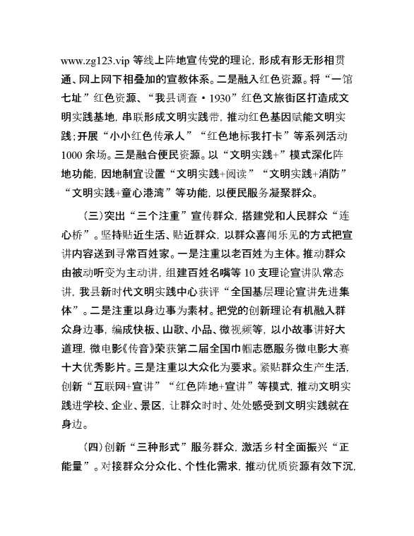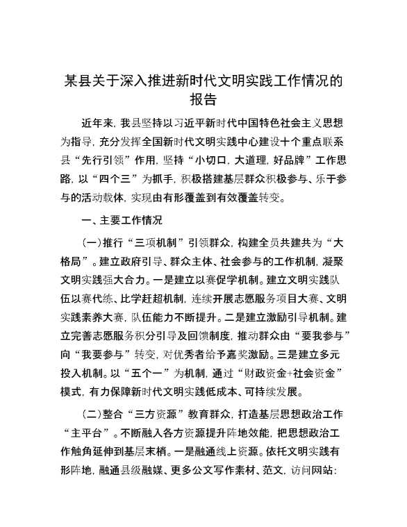 某县关于深入推进新时代文明实践工作情况的报告 2024-09-29 Word模板 84 购买前,请一定要先点击这里看看,欢迎持续关注,精彩模板每天推送 预览结束,本文件为word文档,一共5页,共2013字,请购买后,下载后查看 购买前,请一定要先点击这里看看,欢迎持续关注,精彩模板每天推送 资源下载下载价格29 RMBVIP免费升级VIP点击检测网盘有效后购买有任何充值和下载问题请加微信:xuexixuexi66 0 总结汇报