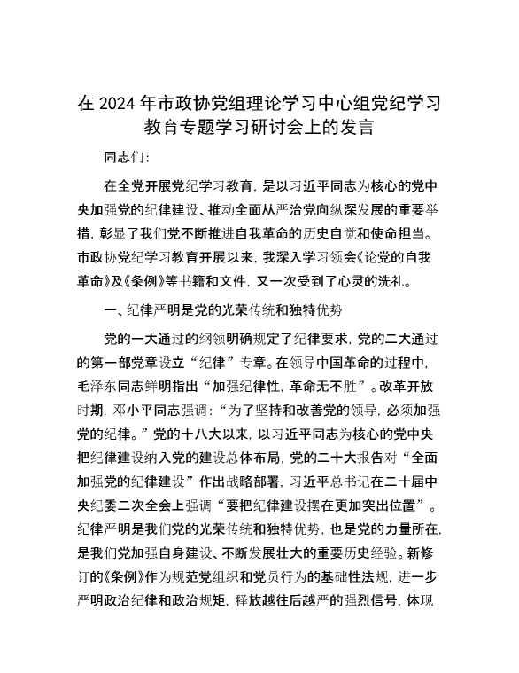 在2024年市政协党组理论学习中心组党纪学习教育专题学习研讨会上的发言 2024-09-29 Word模板 87 购买前,请一定要先点击这里看看,欢迎持续关注,精彩模板每天推送 预览结束,本文件为word文档,一共4页,共1965字,请购买后,下载后查看 购买前,请一定要先点击这里看看,欢迎持续关注,精彩模板每天推送 资源下载下载价格29 RMBVIP免费升级VIP点击检测网盘有效后购买有任何充值和下载问题请加微信:xuexixuexi66 0 演讲发言
