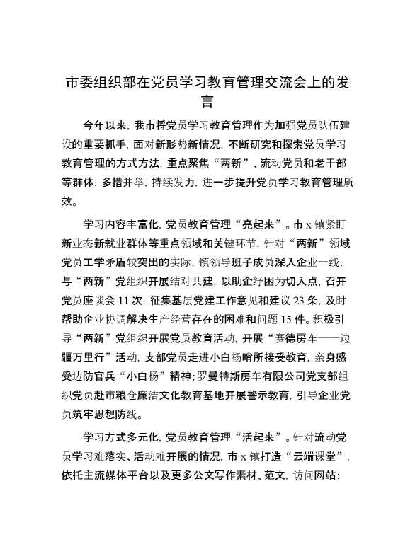 市委组织部在党员学习教育管理交流会上的发言 2024-10-08 Word模板 97 购买前,请一定要先点击这里看看,欢迎持续关注,精彩模板每天推送 预览结束,本文件为word文档,一共2页,共888字,请购买后,下载后查看 购买前,请一定要先点击这里看看,欢迎持续关注,精彩模板每天推送 资源下载下载价格29 RMBVIP免费升级VIP点击检测网盘有效后购买有任何充值和下载问题请加微信:xuexixuexi66 0 演讲发言