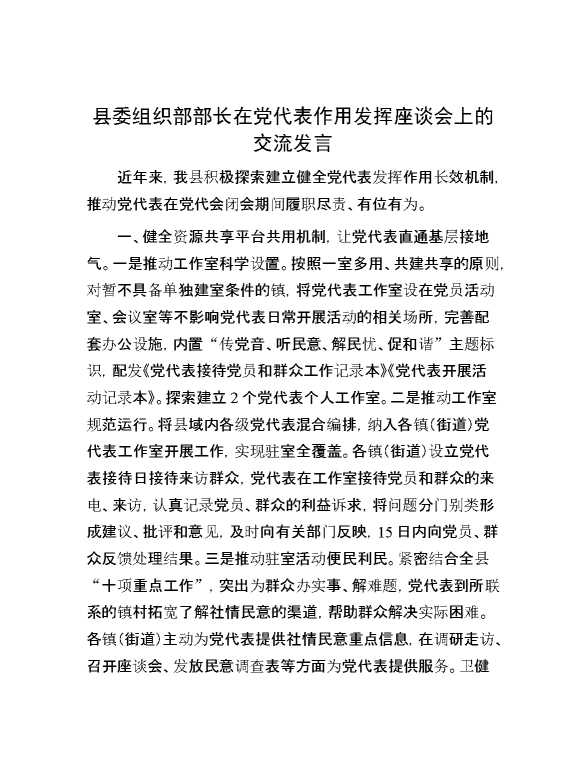 县委组织部部长在党代表作用发挥座谈会上的交流发言 2024-10-08 Word模板 103 购买前,请一定要先点击这里看看,欢迎持续关注,精彩模板每天推送 预览结束,本文件为word文档,一共4页,共1570字,请购买后,下载后查看 购买前,请一定要先点击这里看看,欢迎持续关注,精彩模板每天推送 资源下载下载价格29 RMBVIP免费升级VIP点击检测网盘有效后购买有任何充值和下载问题请加微信:xuexixuexi66 0 演讲发言