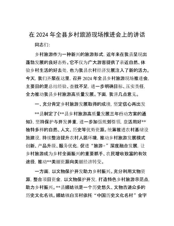 在2024年全县乡村旅游现场推进会上的讲话 2024-10-08 Word模板 83 购买前,请一定要先点击这里看看,欢迎持续关注,精彩模板每天推送 预览结束,本文件为word文档,一共7页,共3216字,请购买后,下载后查看 购买前,请一定要先点击这里看看,欢迎持续关注,精彩模板每天推送 资源下载下载价格29 RMBVIP免费升级VIP点击检测网盘有效后购买有任何充值和下载问题请加微信:xuexixuexi66 0 演讲发言