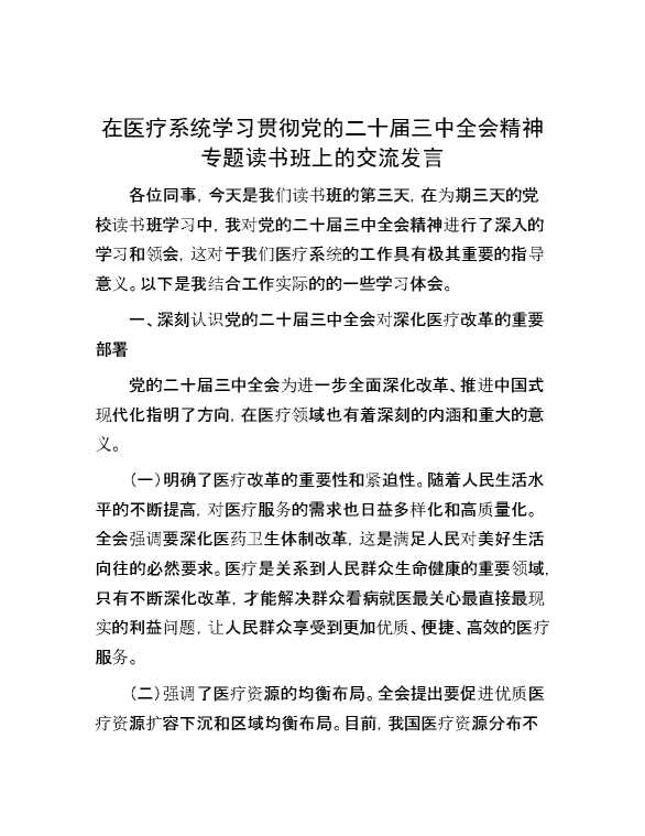 在医疗系统学习贯彻党的二十届三中全会精神专题读书班上的交流发言 2024-10-08 Word模板 92 购买前,请一定要先点击这里看看,欢迎持续关注,精彩模板每天推送 预览结束,本文件为word文档,一共5页,共2104字,请购买后,下载后查看 购买前,请一定要先点击这里看看,欢迎持续关注,精彩模板每天推送 资源下载下载价格29 RMBVIP免费升级VIP点击检测网盘有效后购买有任何充值和下载问题请加微信:xuexixuexi66 0 演讲发言