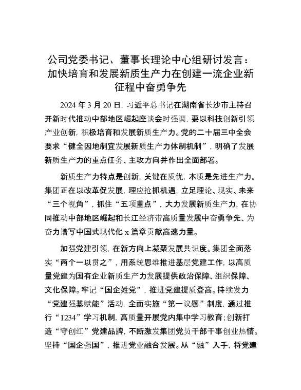 公司党委书记、董事长理论中心组研讨发言:加快培育和发展新质生产力 在创建一流企业新征程中奋勇争先 2024-10-08 Word模板 102 购买前,请一定要先点击这里看看,欢迎持续关注,精彩模板每天推送 预览结束,本文件为word文档,一共6页,共2683字,请购买后,下载后查看 购买前,请一定要先点击这里看看,欢迎持续关注,精彩模板每天推送 资源下载下载价格29 RMBVIP免费升级VIP点击检测网盘有效后购买有任何充值和下载问题请加微信:xuexixuexi66 0 演讲发言