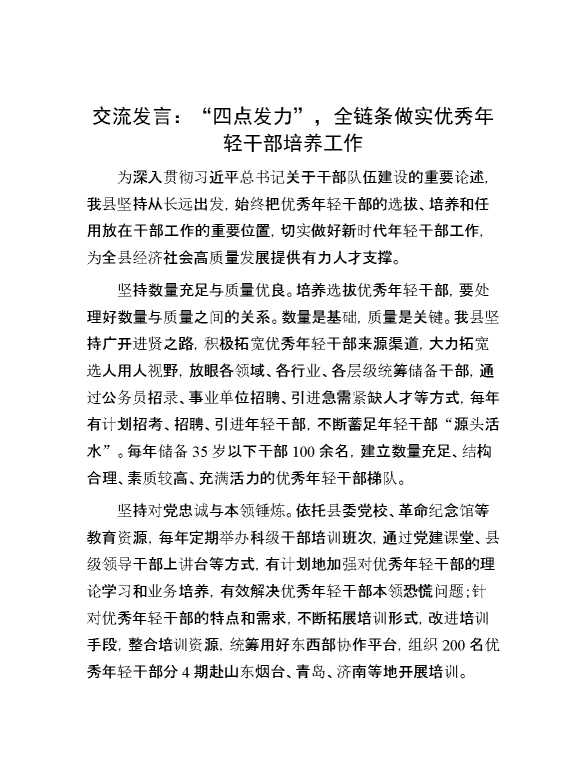 交流发言:“四点发力”,全链条做实优秀年轻干部培养工作 2024-10-08 Word模板 85 购买前,请一定要先点击这里看看,欢迎持续关注,精彩模板每天推送 预览结束,本文件为word文档,一共2页,共910字,请购买后,下载后查看 购买前,请一定要先点击这里看看,欢迎持续关注,精彩模板每天推送 资源下载下载价格29 RMBVIP免费升级VIP点击检测网盘有效后购买有任何充值和下载问题请加微信:xuexixuexi66 0 演讲发言