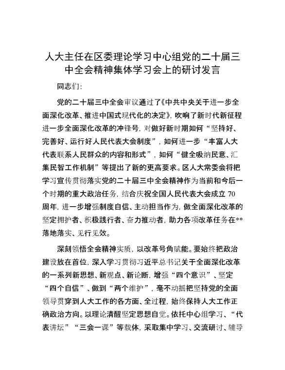 人大主任在区委理论学习中心组党的二十届三中全会精神集体学习会上的研讨发言 2024-10-08 Word模板 86 购买前,请一定要先点击这里看看,欢迎持续关注,精彩模板每天推送 预览结束,本文件为word文档,一共4页,共1831字,请购买后,下载后查看 购买前,请一定要先点击这里看看,欢迎持续关注,精彩模板每天推送 资源下载下载价格29 RMBVIP免费升级VIP点击检测网盘有效后购买有任何充值和下载问题请加微信:xuexixuexi66 0 演讲发言