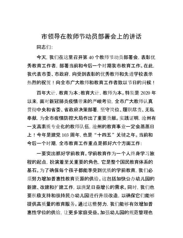 市领导在教师节动员部署会上的讲话 2024-10-08 Word模板 94 购买前,请一定要先点击这里看看,欢迎持续关注,精彩模板每天推送 预览结束,本文件为word文档,一共5页,共2373字,请购买后,下载后查看 购买前,请一定要先点击这里看看,欢迎持续关注,精彩模板每天推送 资源下载下载价格29 RMBVIP免费升级VIP点击检测网盘有效后购买有任何充值和下载问题请加微信:xuexixuexi66 0 演讲发言