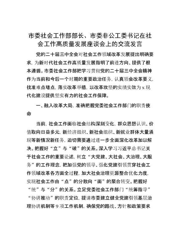 市委社会工作部部长、市委非公工委书记在社会工作高质量发展座谈会上的交流发言 2024-10-08 Word模板 85 购买前,请一定要先点击这里看看,欢迎持续关注,精彩模板每天推送 预览结束,本文件为word文档,一共4页,共1640字,请购买后,下载后查看 购买前,请一定要先点击这里看看,欢迎持续关注,精彩模板每天推送 资源下载下载价格29 RMBVIP免费升级VIP点击检测网盘有效后购买有任何充值和下载问题请加微信:xuexixuexi66 0 演讲发言