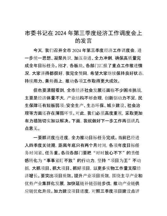 市委书记在2024年第三季度经济工作调度会上的发言 2024-10-08 Word模板 87 购买前,请一定要先点击这里看看,欢迎持续关注,精彩模板每天推送 预览结束,本文件为word文档,一共5页,共2214字,请购买后,下载后查看 购买前,请一定要先点击这里看看,欢迎持续关注,精彩模板每天推送 资源下载下载价格29 RMBVIP免费升级VIP点击检测网盘有效后购买有任何充值和下载问题请加微信:xuexixuexi66 0 演讲发言