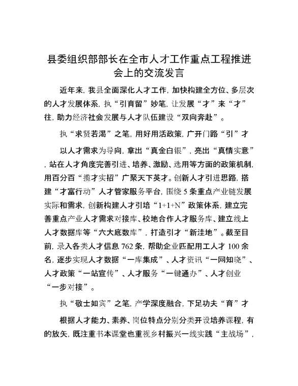县委组织部部长在全市人才工作重点工程推进会上的交流发言 2024-10-08 Word模板 91 购买前,请一定要先点击这里看看,欢迎持续关注,精彩模板每天推送 预览结束,本文件为word文档,一共2页,共933字,请购买后,下载后查看 购买前,请一定要先点击这里看看,欢迎持续关注,精彩模板每天推送 资源下载下载价格29 RMBVIP免费升级VIP点击检测网盘有效后购买有任何充值和下载问题请加微信:xuexixuexi66 0 演讲发言