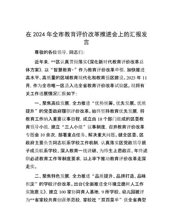 在2024年全市教育评价改革推进会上的汇报发言 2024-10-08 Word模板 101 购买前,请一定要先点击这里看看,欢迎持续关注,精彩模板每天推送 预览结束,本文件为word文档,一共4页,共1461字,请购买后,下载后查看 购买前,请一定要先点击这里看看,欢迎持续关注,精彩模板每天推送 资源下载下载价格29 RMBVIP免费升级VIP点击检测网盘有效后购买有任何充值和下载问题请加微信:xuexixuexi66 0 演讲发言
