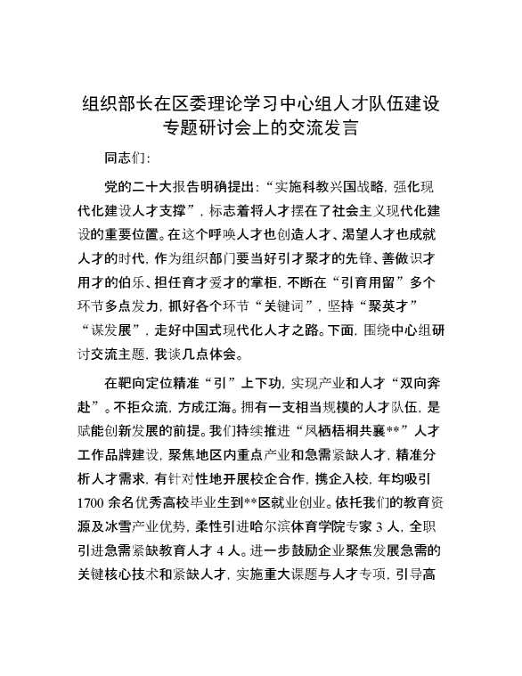组织部长在区委理论学习中心组人才队伍建设专题研讨会上的交流发言 2024-10-08 Word模板 120 购买前,请一定要先点击这里看看,欢迎持续关注,精彩模板每天推送 预览结束,本文件为word文档,一共3页,共1357字,请购买后,下载后查看 购买前,请一定要先点击这里看看,欢迎持续关注,精彩模板每天推送 资源下载下载价格29 RMBVIP免费升级VIP点击检测网盘有效后购买有任何充值和下载问题请加微信:xuexixuexi66 0 演讲发言
