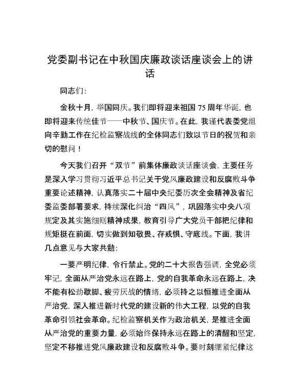 党委副书记在中秋国庆廉政谈话座谈会上的讲话 2024-10-08 Word模板 98 购买前,请一定要先点击这里看看,欢迎持续关注,精彩模板每天推送 预览结束,本文件为word文档,一共3页,共1464字,请购买后,下载后查看 购买前,请一定要先点击这里看看,欢迎持续关注,精彩模板每天推送 资源下载下载价格29 RMBVIP免费升级VIP点击检测网盘有效后购买有任何充值和下载问题请加微信:xuexixuexi66 0 演讲发言