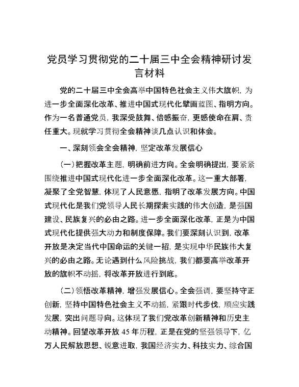 党员学习贯彻党的二十届三中全会精神研讨发言材料 2024-10-08 Word模板 95 购买前,请一定要先点击这里看看,欢迎持续关注,精彩模板每天推送 预览结束,本文件为word文档,一共5页,共2244字,请购买后,下载后查看 购买前,请一定要先点击这里看看,欢迎持续关注,精彩模板每天推送 资源下载下载价格29 RMBVIP免费升级VIP点击检测网盘有效后购买有任何充值和下载问题请加微信:xuexixuexi66 0 演讲发言