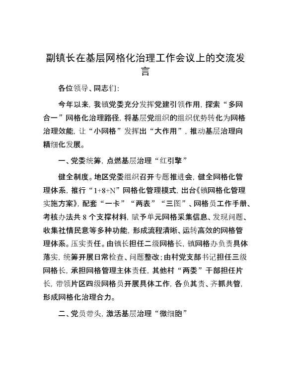 副镇长在基层网格化治理工作会议上的交流发言 2024-10-08 Word模板 98 购买前,请一定要先点击这里看看,欢迎持续关注,精彩模板每天推送 预览结束,本文件为word文档,一共2页,共839字,请购买后,下载后查看 购买前,请一定要先点击这里看看,欢迎持续关注,精彩模板每天推送 资源下载下载价格29 RMBVIP免费升级VIP点击检测网盘有效后购买有任何充值和下载问题请加微信:xuexixuexi66 0 演讲发言